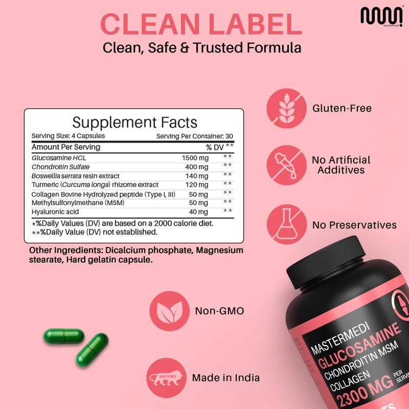 Support Joint Health Naturally MasterMedi's Glucosamine Chondroitin MSM Collagen formula delivers a powerful 2300mg blend per serving, featuring essential compounds that help maintain joint comfort and mobility. Formulated with Chondroitin not derived from shark, plus MSM, Collagen, Boswellia, Turmeric, and Hyaluronic Acid. What's Inside: ?? 2300mg per Serving ?C Formulated with Glucosamine HCL, Chondroitin (bovine-sourced), MSM, and Type II Collagen ?? Botanical Additions ?C Includes Turmeric, Boswellia Serrata, and Hyaluronic Acid ?? No Shark Ingredients ?C Chondroitin is not sourced from shark cartilage ?? 30-Day Supply ?C 120 easy-to-swallow capsules, free from synthetic dyes or artificial flavors ?? Fish Warning ?C Contains marine collagen from fish. Not suitable for individuals with fish allergies.