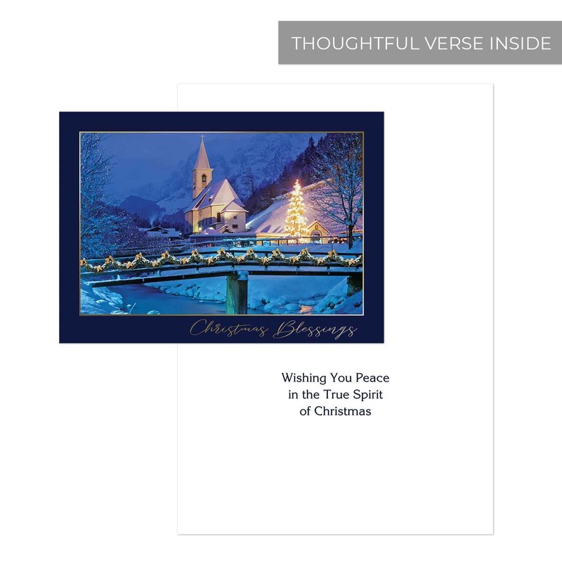 - Traditional Design: Classic Christmas card features a peaceful country church and bridge scene with gold foil accents. This charming note card design includes "Wishing You Peace in the True Spirit of Christmas" sentiment on the inside with space to write your own meaningful message.