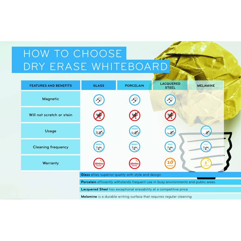 • Magnetic dry wipe surface is recommended for frequent use, 2' x 3'