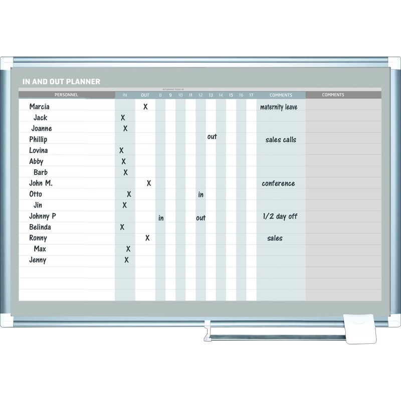 The MasterVision Magnetic Gold Ultra Dry Erase In and Out Planning Board is recommended for frequent use. It is perfect for displaying staff schedules or leaving important messages. The sliding aluminum pen tray keeps pens and magnetic accessories where you want them. This dry erase board features an easy 4-corner mounting system and hardware is included. Make changes to flexible schedules with ease with this planning board. Measures 3 x 2 feet.