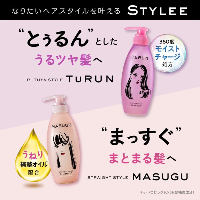 - From "Style", a brand that will fulfill that hairstyle you would like to return to a salon, "Tourun", a series that achieves a smooth and glossy hair. The texture is applied and moisturizing coating, and the more you use it, it will lead to your hair with a glossy shine