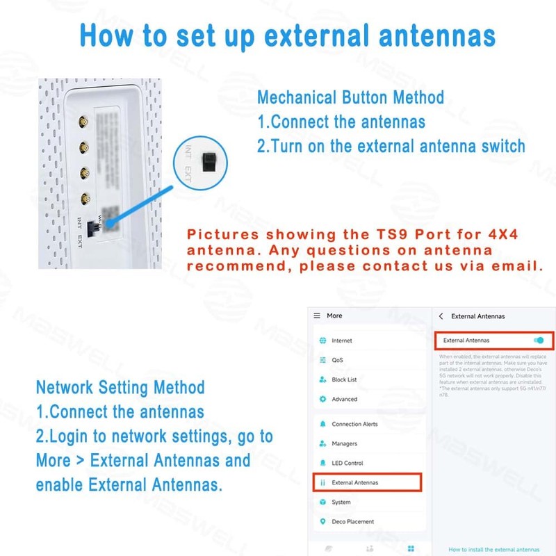 - 🔴Note: 1. Enable the "External antenna" mode, after connected 4G/5G antenna. 2. Low Gain NOT for speed competition/improvement. 3. This is a SISO antenna with only one cable, which is the best choice for routers with only one LTE interface. If it is a MU-MIMO router, I strongly recommend that you search for Maswell MIMO Antenna to choose or contact us via email for help.