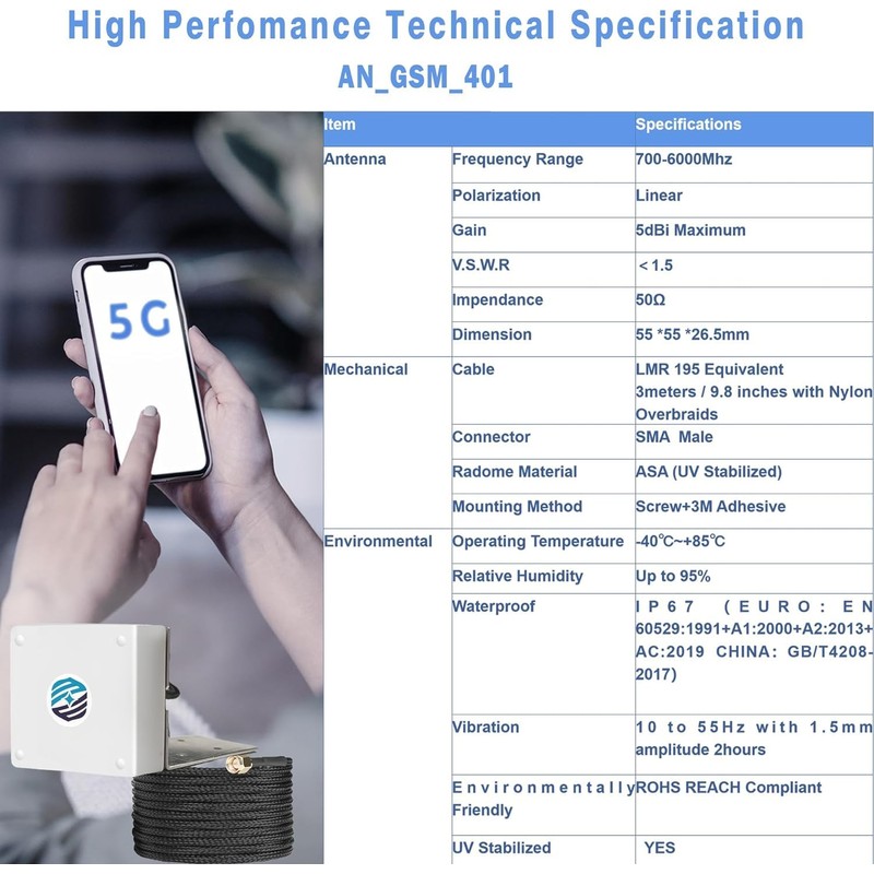 - Indoor and outdoor installation: ASA material housing has UV stability, coupled with IP67 waterproof and -40°C to +80°C weatherproof design to ensure a long service life of the antenna. Suitable for outdoor use in vending machines, meter housings, tool sheds. Or other scenarios that require a thin, high-performance outdoor antenna.