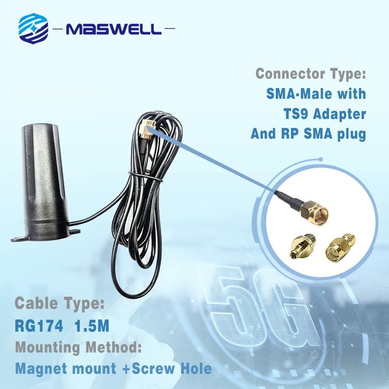 Maswell M2M IoT Antenna, Omni Cellular 600-6000MHz with WiFi 6, Cellular 5G 4G LTE 3G, SMA Plug with RP-SMA & TS9 for Vending Machines, Meters and Agriculture, Magnetic Mounting and Screw Mounting