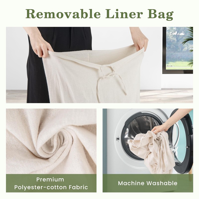 • Removable Liner Bag: Equipped with a removable liner bag, which makes it easy to transport clothes to the washing machine, as well as protecting clothes from touching the basket directly. Besides, the polycotton fabric is also machine washable, offering much convenience.
