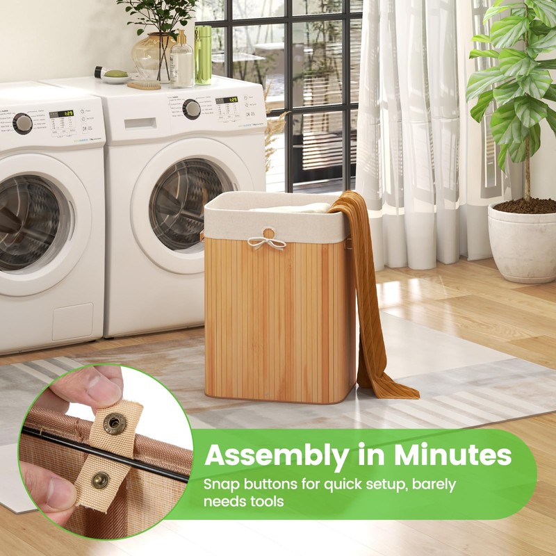 Crafted from high-quality bamboo material, this laundry hamper is both long-lasting and lightweight. Meanwhile, the built-in metal tube reinforces the construction, offering a more sturdy frame. Equipped with a detachable liner bag, the polycotton material feels soft and won’t scratch your clothes. The removable lid with handle helps to cover messy clothes and avoids smell from spreading. At the same time, the side carrying handles make it easier to move the clothes hamper, allowing for multi-scene uses. This bamboo laundry hamper accommodates to days of dirty clothes for its large inner space of 72L, enough for whole family use. Additionally, when not in use, the clothes hamper can be folded flat to save space.