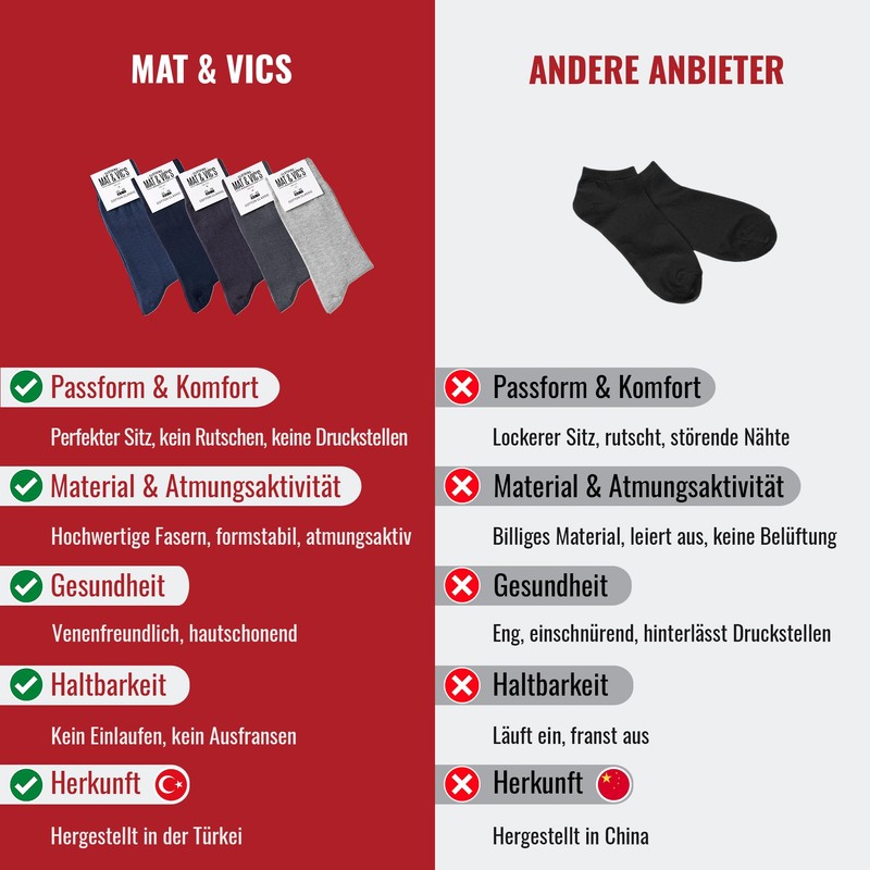 - Clearly marked to avoid mix ups in sizes EU 35–38 (UK 2.5–5), EU 39–42 (UK 5.5–8) (UK 5.5–8), EU 47–50 (UK 12–15), pack of 5 or 10 socks, black, for men, short trainers socks, invisible thermal socks, work socks, from Mat and Vic’s.