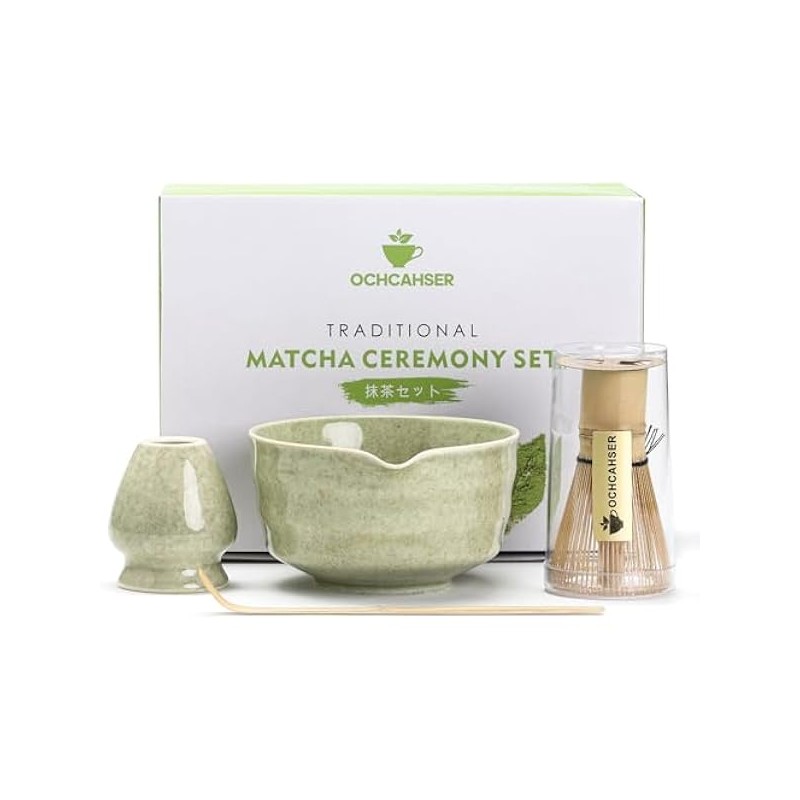 Matcha Set, Japanese Tea Set Includes Matcha Bowl with Spout, Matcha Whisk Holder, Bamboo Matcha Whisk and Bamboo Scoop, 17 oz Mottled Tea Green Glaze Ceramic Matcha Kit for Tea Lovers