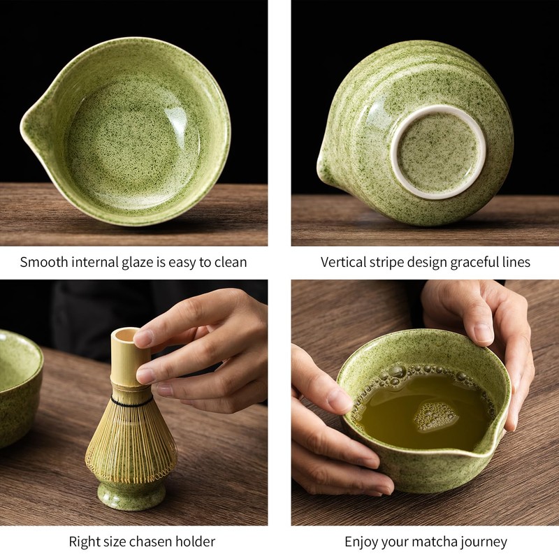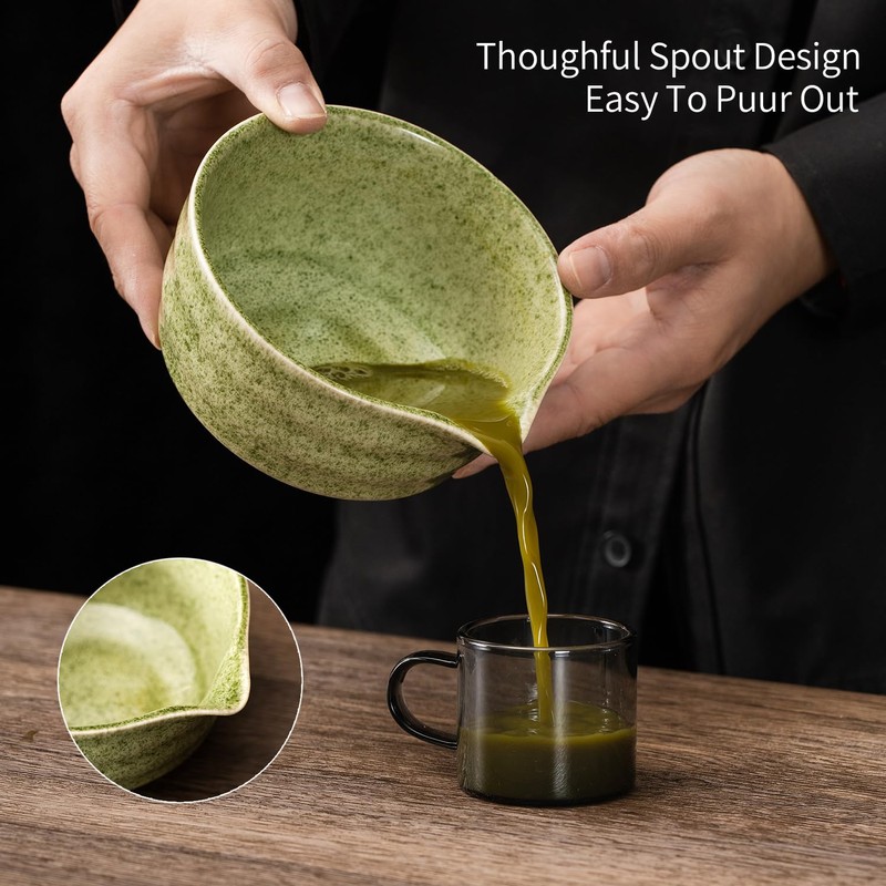 - USER-FRIENDLY DESIGN: The Matcha bowl is thickened and has an eagle beak at the mouth, which makes it easier to pour after making. The side of the matcha bowl has anti-slip lines, which makes it difficult to slip when making matcha. The spotted Jade green glaze brings you closer to the matcha tea ceremony.