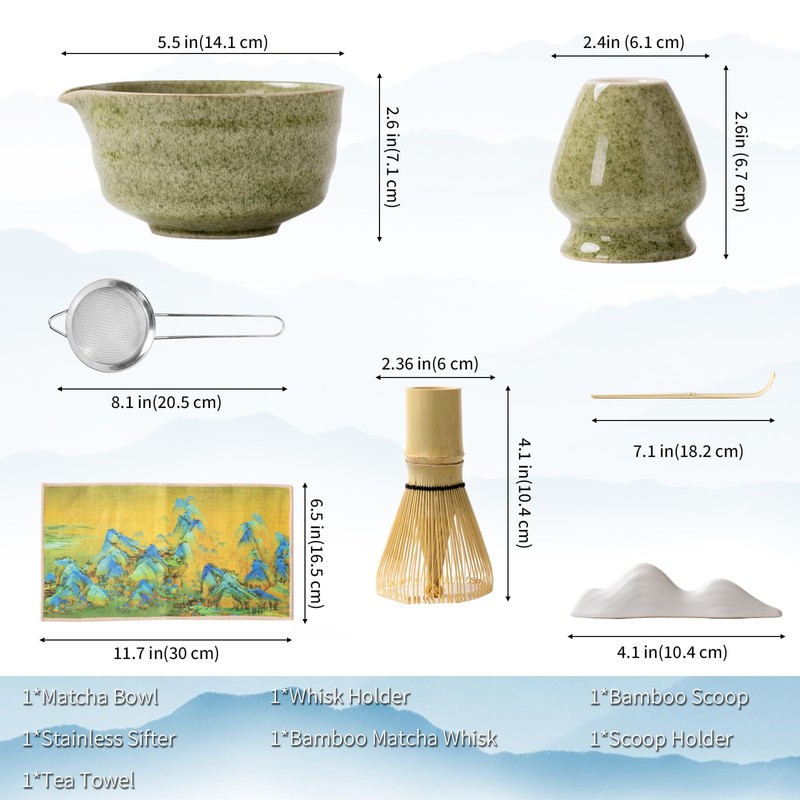 - HIGH QUALITY 7 PCS MATCHA SET: Our Complete Matcha Kit includes all the essentials: 1 * Matcha Bowl with Spout (Chawan) 550 ml/18.6 oz, 1 * Bamboo Matcha Whisk, 1 * Cermaic Whisk Holder, 1 * Bamboo Scoop, 1 * Cermaic Scoop Stand, 1 * Matcha Powder Sifter, 1 * Tea Towel. Each tool is precision-crafted for effortless elegance. Whether you're an experienced tea lover or a beginner, this kit provides everything you need for a traditional and refined matcha experience at home.