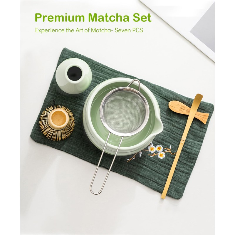 - Complete Match Ceremonies Set: A complete set of 7 essential matcha whisk set: 1 matcha bowl with spout, 1 bamboo matcha broom, 1 teaspoon, 1 matcha strainer, 1 cotton tea towel, 1 ceramic whisk stand and 1 1 bamboo spoon holder. This product set makes the matcha ceremony simple and elegant and allows easy entry into the matcha lifestyle.