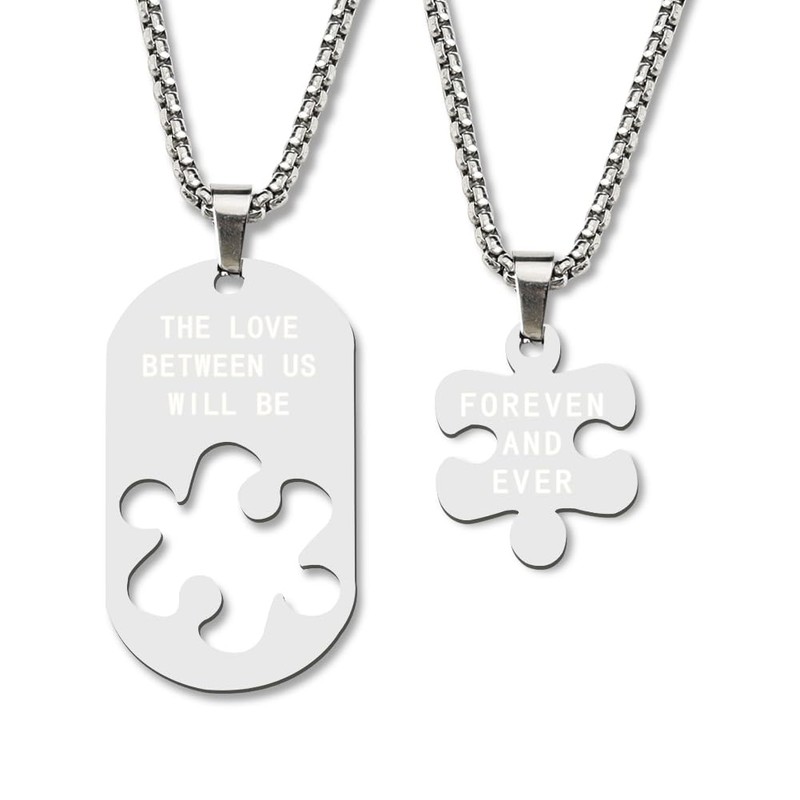 - 【Matching Couple Necklaces for Boyfriend and Girlfriend】:This couple necklace set consists of 1 pc dog tag necklace for men, 1 pc puzzle piece necklace for women, the valentines necklace features intricate engraving that reads "THE LOVE BETWEEN US WILL BE FOREVER AND EVER" symbolizing your love and unity, great matching puzzle necklaces for couples him her