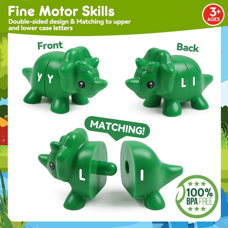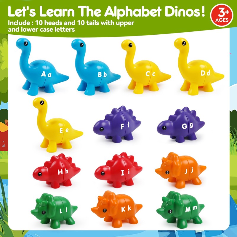 - Double-Sided Design: This toy features 13 double-sided dinosaur with uppercase and lowercase letters. Kids can match the letters to the corresponding dinosaurs, enhancing their letter recognition skills.alphabet dinos are easy to put together