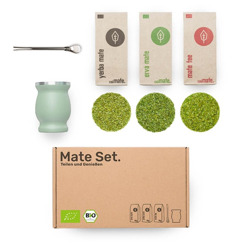- All-round carefree mate set: 3 organic mates each 100 g mate tea, Erva Mate and Yerba Mate (total 300 g mate) + 1 original bombillas (straw) + 1 calabash double wall design (mate cup) + preparation instructions (English language not guaranteed).