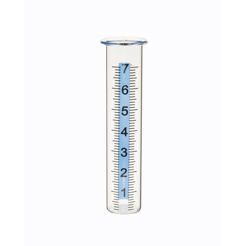 Color: ClearMaterial: GlassDiameter with lip: 2 1/8 "Diameter without lip: 1 3/4 "Rainfall Capacity: 7 "Height: 8 1/8 "