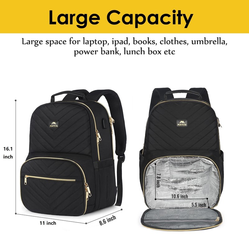 MATEIN Lunch Backpack for Women, 15.6inch Water Resistant Insulated Cooler Backpack Purse, Stylish Quilted Laptop Backpack with USB Charging Port for College Work Pincic Camping Beaches