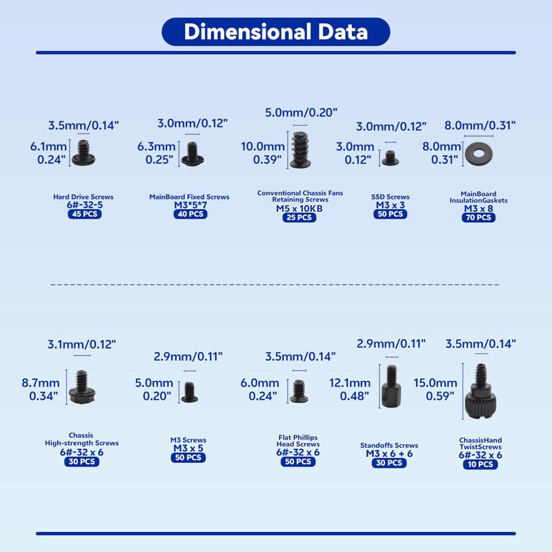 - Package included:SSD screw,fan screw,Insulating Gasket,Standoffs,Thumbscrews,Hard drive screws,Motherboard Screws,High-Strength Screws,Screwdriver