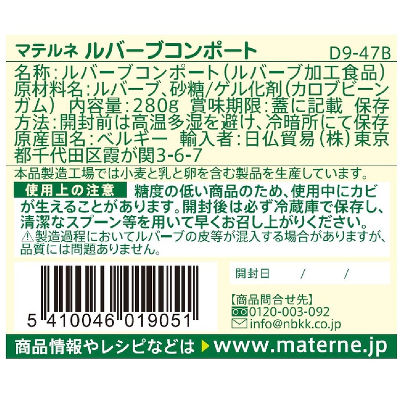 - Ingredients: Rhubarb, sugar/gelling agent (carobe bean gum); Contents: 9.8 oz (280 g); Country of Origin: Belgium