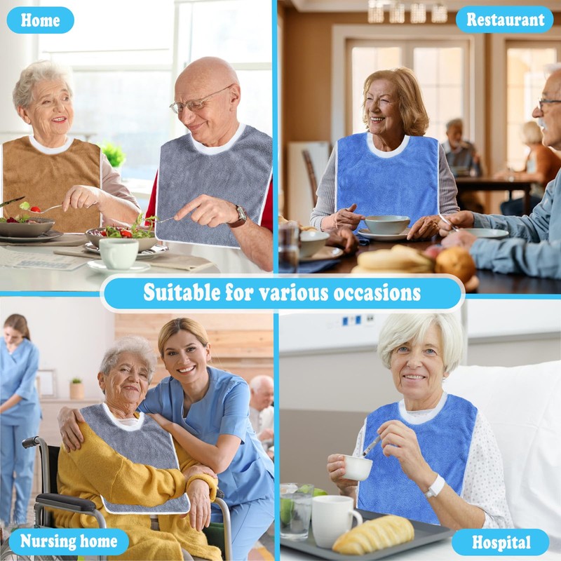 - Adult Bib Set: You will receive 3 pcs bibs for adults in blue, gray and khaki colors. The adult bibs for elderly are made of coral fleece material, very soft, comfortable, and highly absorbent. Each bib measures 23.6 "x 15.7" inch, with wide coverage