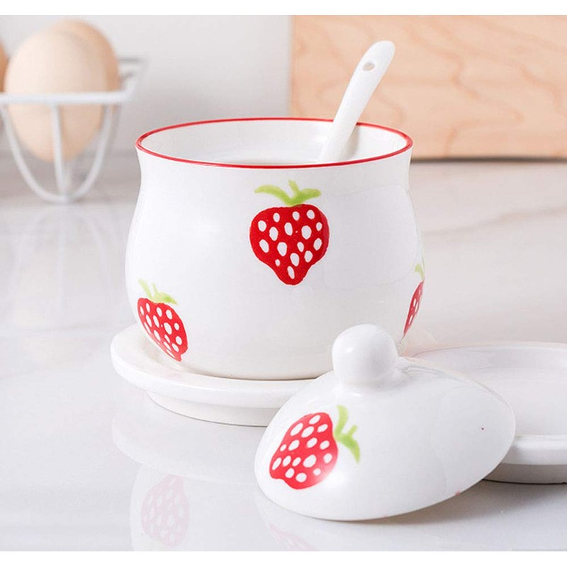 Mathew Hand-painted Strawberry Ceramic Seasoning Jar Condiment Pot Sugar Bowl with Lid and Spoon