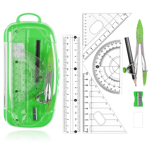 Maths Set | 8Pcs Compass Maths Protractor and Compass Set | Geometry Sets Triangle Ruler Protractor Rubber Sharpener with Storage Box (Emerald)