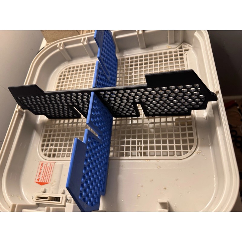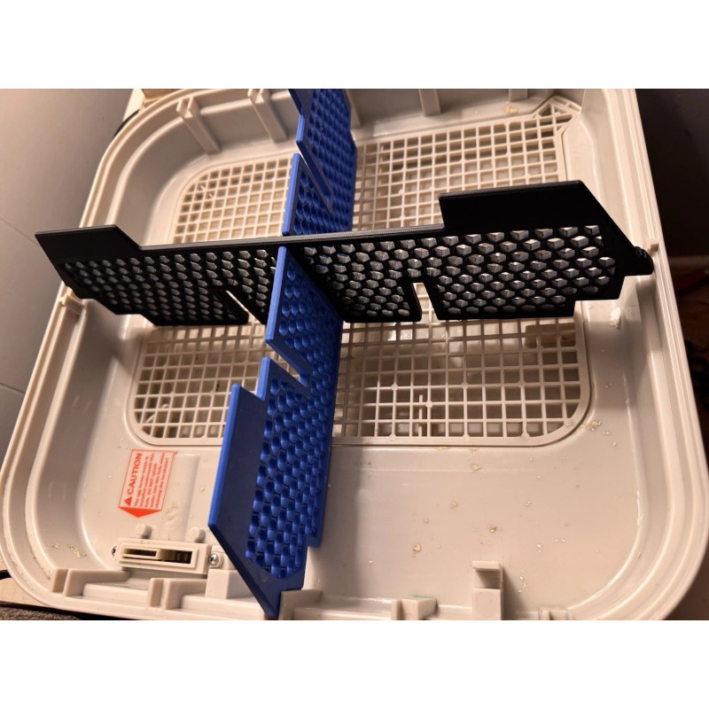 Important note: you will need to remove the egg turner bar for divider 1 to properly fit. You will need to slightly stretch to place it into the proper groves on the incubator. If you have an additional divider #2 it will float in the slots as shown in photos.