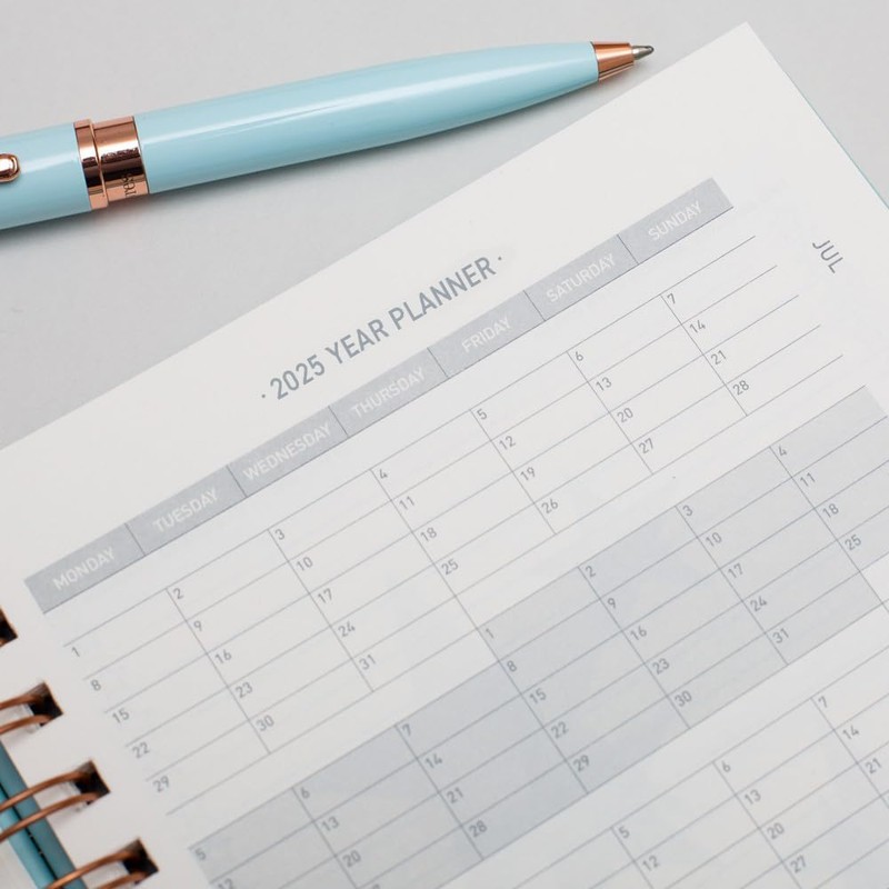 Matilda Myres Terminplaner 2025, A5, Wochenansicht, roségoldener Spiralbindung, Januar bis Dezember, fester Einband, Blau