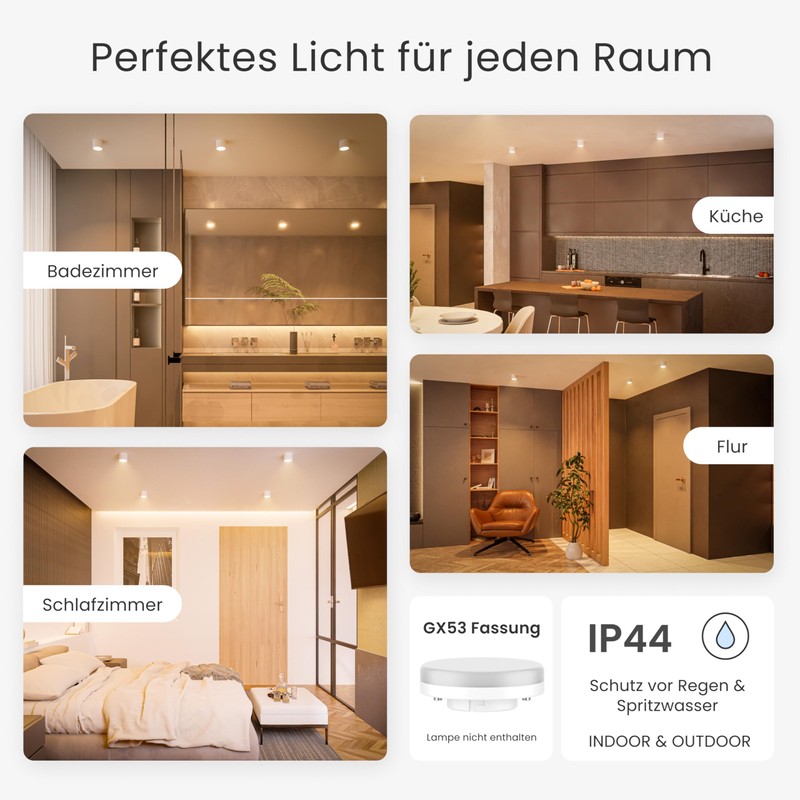 - Protection against splashes of water (IP44): Ideal for wet rooms such as bathrooms, laundry rooms or covered outdoor areas as an outdoor surface-mounted spot – thanks to IP44, the GX53 surface-mounted spot is protected from splashes of water and dust.