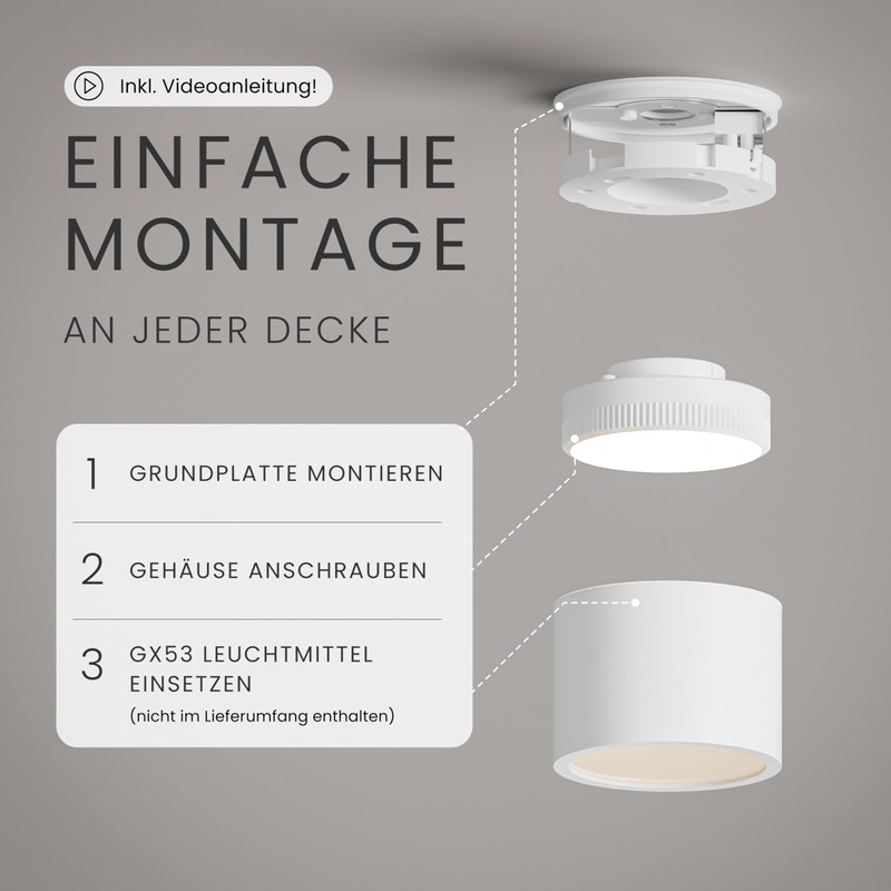 - Easy to install: the GX53 surface-mounted spotlights white are quickly mounted on any ceiling – no installation required! Ideal for living rooms, hallways, offices or as a replacement for classic recessed spotlights. Direct connection to 230V.