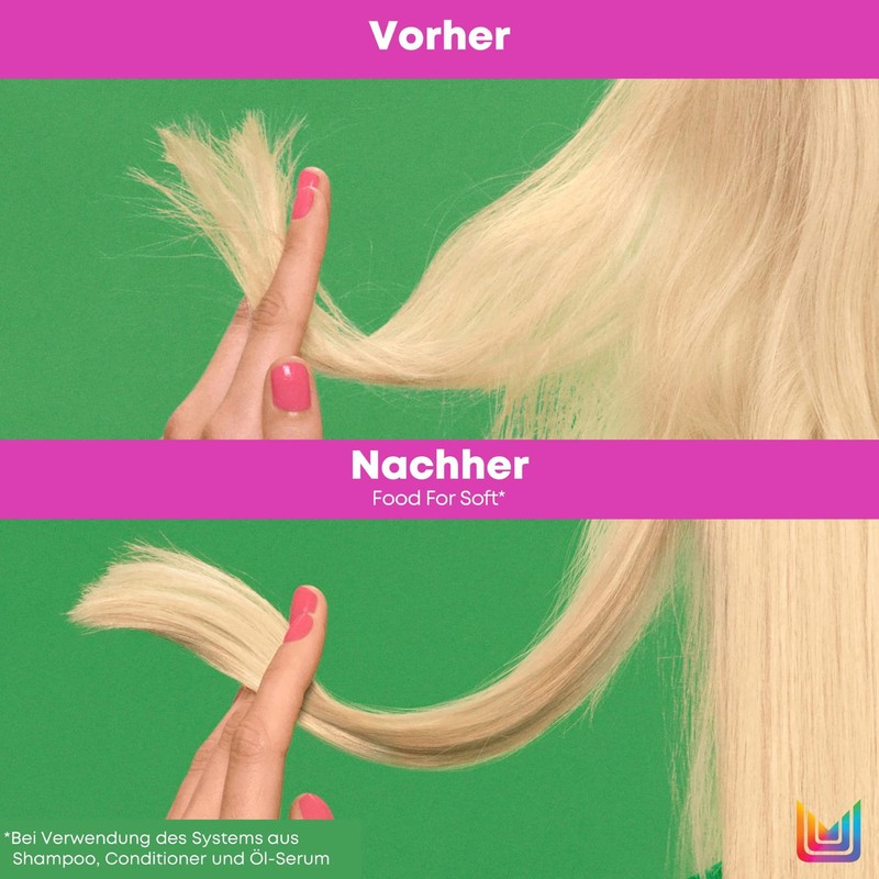 - Eine haselnussgroße Menge des Shampoos auftragen, aufschäumen und gründlich ausspülen. Für optimale Ergebnisse mit der Food For Soft Spülung und der Food For Soft Öl-Maske kombinieren.