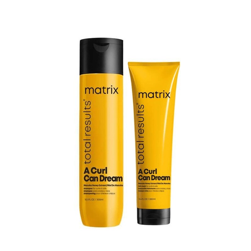 Matrix Total Results Curl Can Dream Shampoo and Mask Bundle includes Matrix A Curl Can Dream Shampoo 300ml and Matrix A Curl Can Dream Rich Mask 280ml, both infused with Manuka honey extract to preserve the pattern of curls and coils.