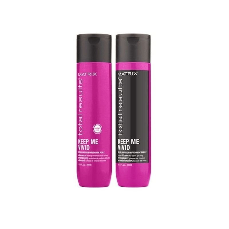 The Matrix Total Results Keep Me Vivid Shampoo and Conditioner Bundle includes a sulfate-free shampoo and conditioner that work together to maintain hair color vibrancy and prevent color fade.