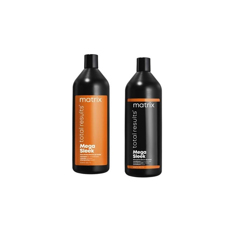 This bundle includes Matrix Total Results Mega Sleek Shampoo 1000ml and Matrix Total Results Mega Sleek Conditioner 1000ml. The shampoo cleanses as it moisturizes, smoothes and helps repair damage, controlling frizz with all-day humidity protection. The conditioner with smoothing shea butter helps control rebellious, unruly hair and manages frizz against humidity for smoothness. Hair is smooth, shiny and defrizzed.