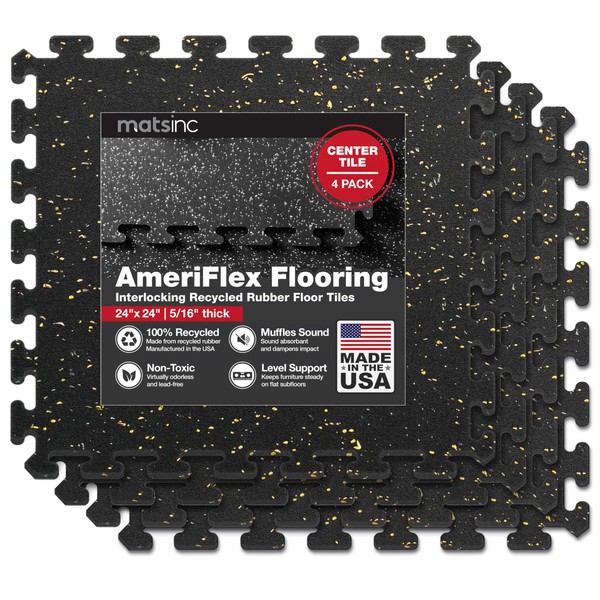 Mats Inc. AmeriFlex Rubber Floor Mats - Recycled Rubber Gym Flooring for Home Gym, Interlocking Exercise Tiles, Made in The USA, Gym Tiles, Center (4 Tiles/16 Sq. Ft.), Black with Tan Speck