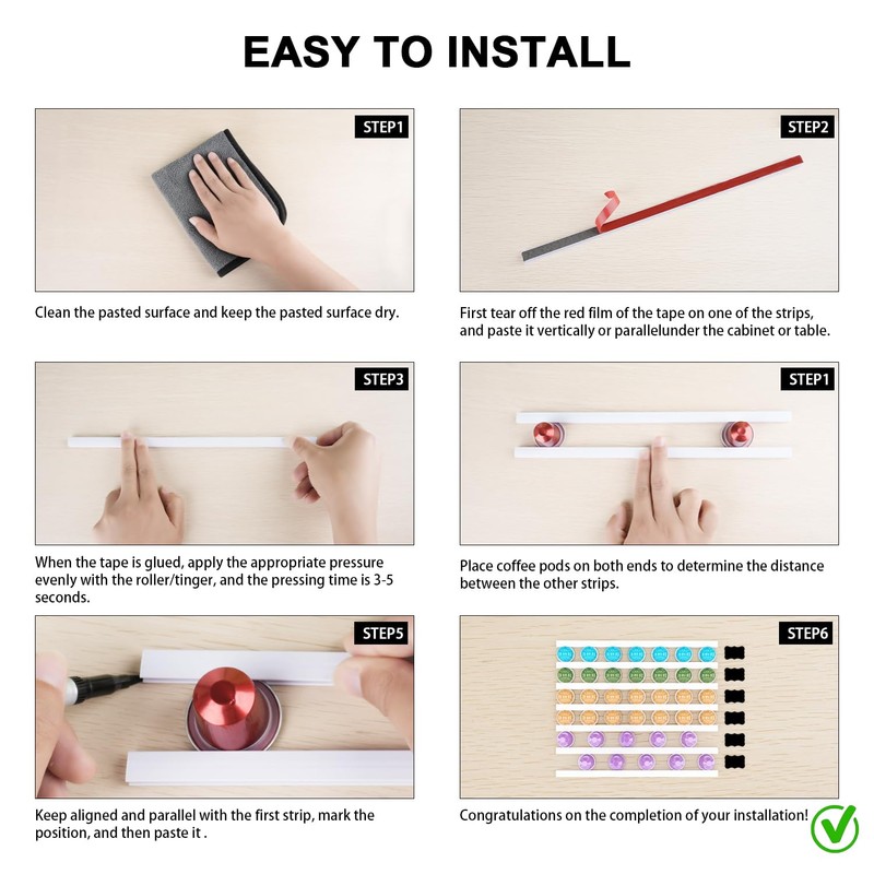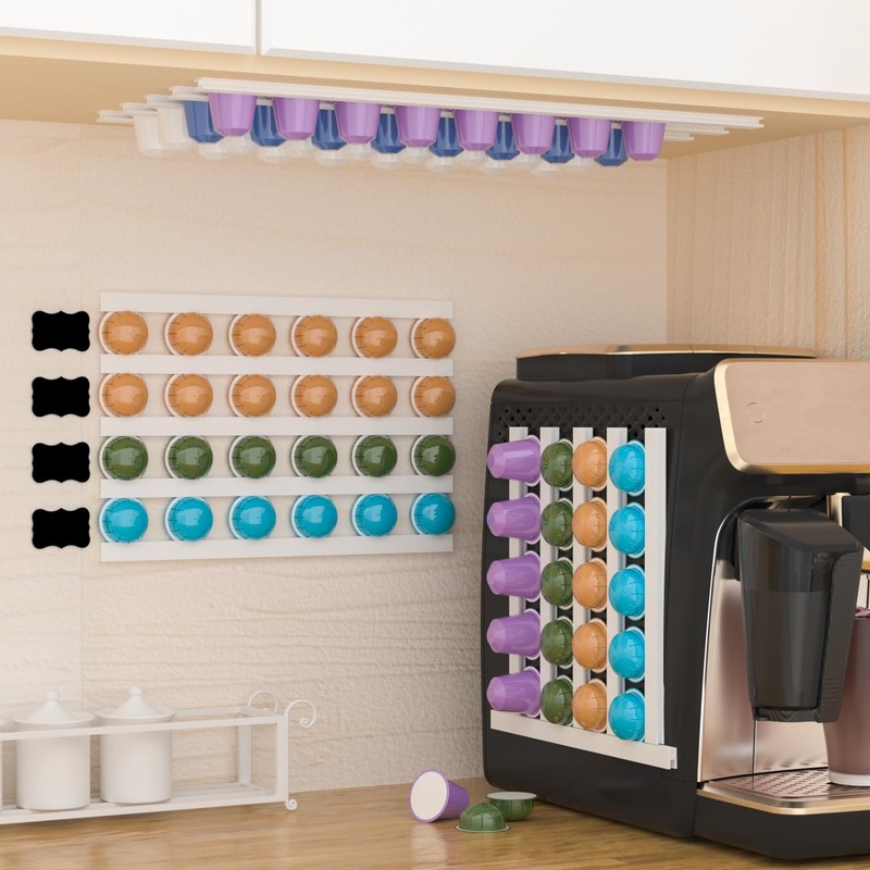 - Easy To Mount - This coffee pods holder is presented with adhesive tape, no drilling is required, quickly and easily mount horizontally or vertically on wall, inside cabinets, above or below cabinets, or cut to any size you want. The adhesive tape will not damage the product and the desktop and is easy to tear off without Leave a trace. It is a must-have coffee pods organizer at home and office.