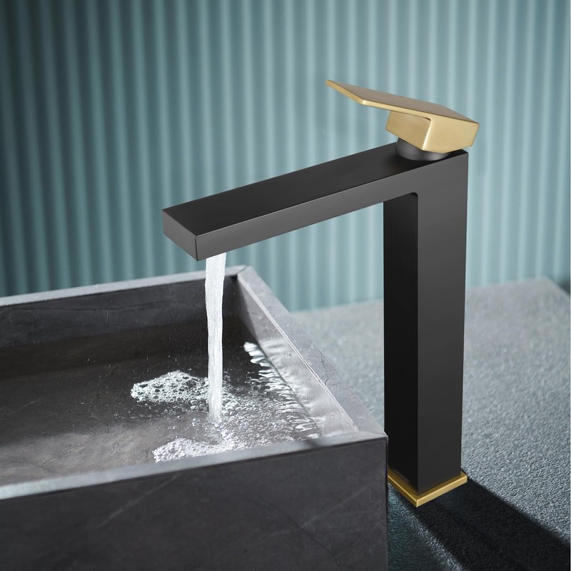 Matte Black and Brushed Gold Vessel Sink Faucet, Lava Odoro Single Handle Bathroom Faucet Single Hole Bathroom Sink Faucet Tall Bowl Sink Faucet with Drain Assembly, BF307-GB-T