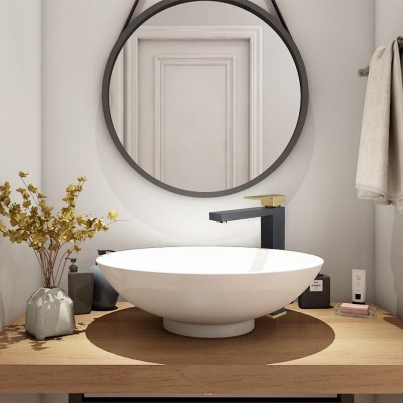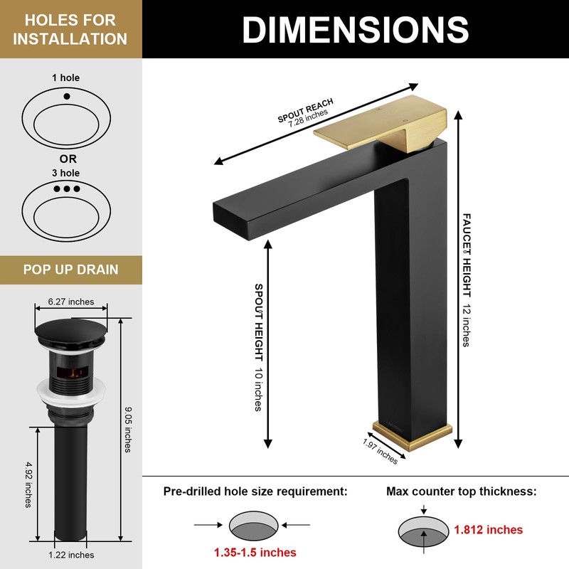 - Spot-Free Finish - The vessek sink faucet is black gold and finish plated with multiple layers to resists water spots and fingerprint, requiring less cleaning. A matching finish pop-up drain assembly.