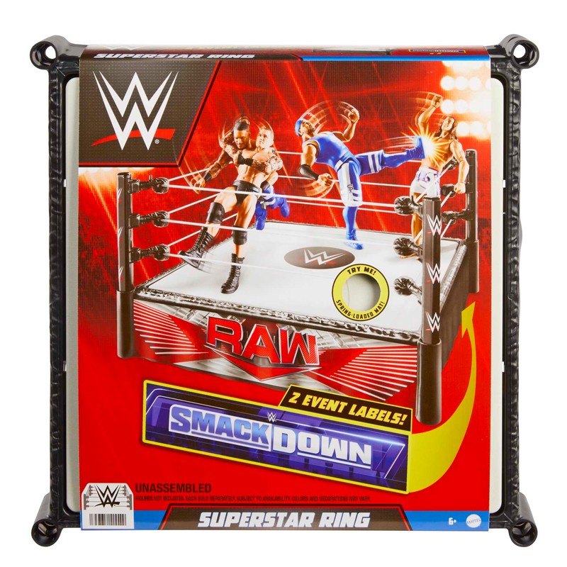 Recreate the in-ring action with the WWE Superstar Ring. This authentic -inch ring features Pro-Tension Ropes for launching attacks and a Spring-Loaded Mat for extra bounce from slams. It's two events in one with RAW and Smackdown apron stickers. Play out matches with WWE Basic, Elite Collection, and Ultimate Edition action figures (figures sold separately, subject to availability)! Colors and decorations may vary.