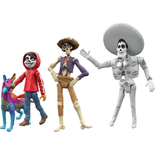 - Las cifras de acción están diseñadas como aparecen en la Tierra de los Muertos, con Dante en forma de guía espiritual alebrije, Miguel en disfraz de cara blanca y Héctor y Ernesto en sus formas de esqueleto.