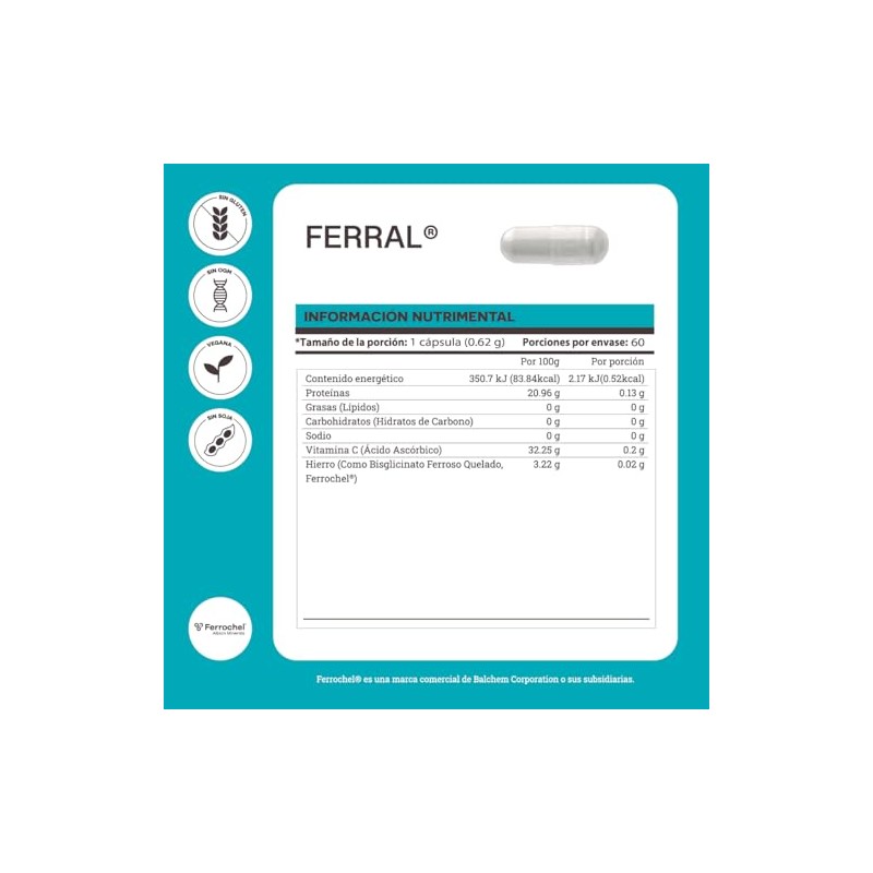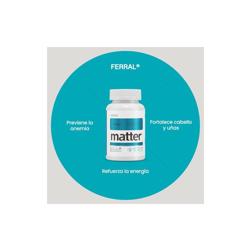 MATTER SMART NUTRIENTS - MATTER SMART NUTRIENTS - Ferral Bisglicinato Ferroso con Vitamina C, Suplemento de Hierro de Alta Absorción, Cápsulas Veganas - 60 Cápsulas