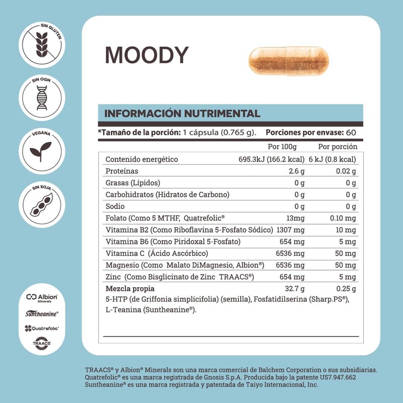 - Ingredientes por porción (dosis diaria recomendada): Folato (Como 5 MTHF, Quatrefolic) 0,10 mg, Vitamina B2 (Como Riboflavina 5-Fosfato Sódico) 10 mg, Vitamina B6 (Como Piridoxal 5-Fosfato) 5 mg, Vitamina C (Ácido Ascórbico) 50 mg, Magnesio (Como Malato DiMagnesio, Albion) 50 mg, Zinc (Como Bisglicinato de Zinc TRAACS) 5 mg. Mezcla propia 0,25 g: 5-HTP (de Griffonia simplicifolia) (semilla), Fosfatidilserina (Sharp.PS), L-Teanina (Suntheanine)