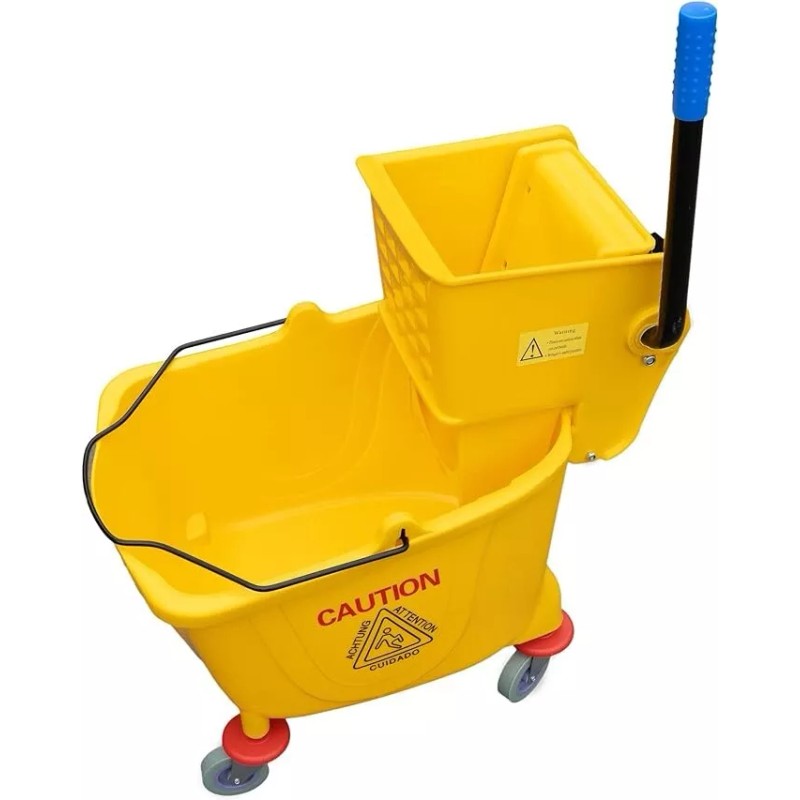 - Keep water from splashing on the floor when you wring out your mop with the spill-resistant side press. The 34-quart, extra-deep bucket further reduces the chance of spills while moving from room to room and allows users to clean longer before changing out the mop water.