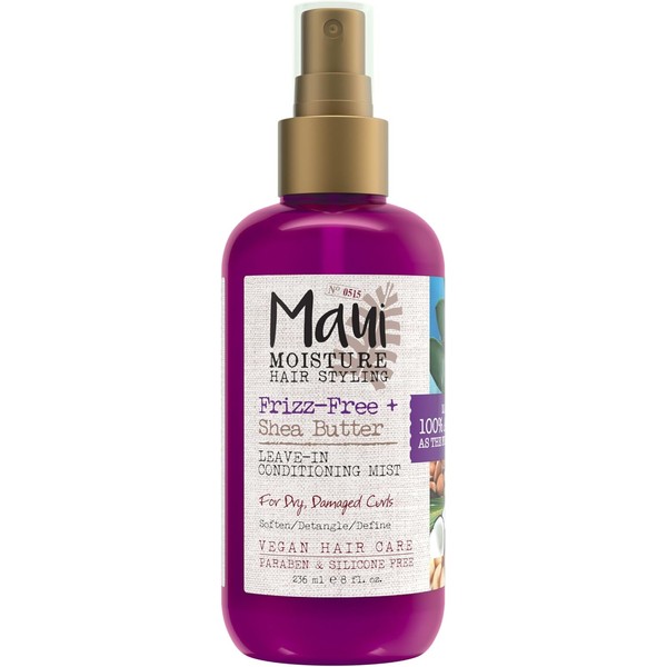 - Condición todo el día: mantén los rizos hidratados y de aspecto saludable con Maui Moisture Frizz y manteca de karité sin encrespamiento