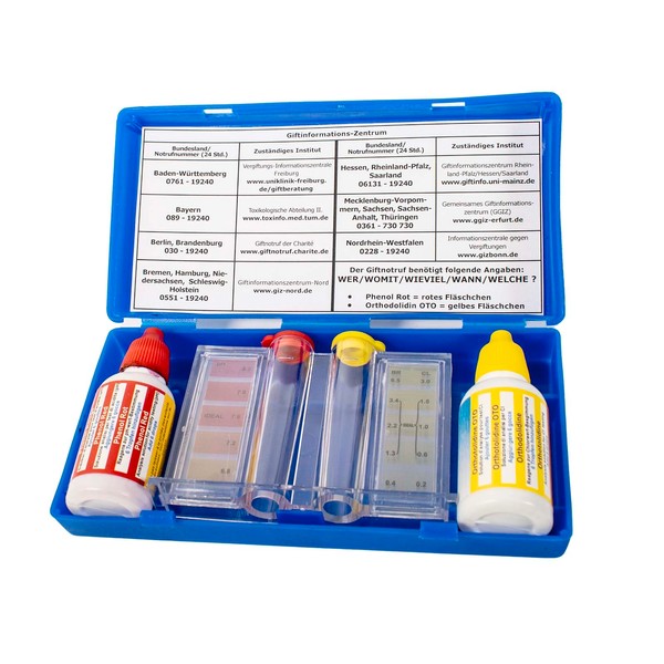 - Complete set with 2 test strips, 2 test tubes, 1 vial of phenol and 1 vial of ortholidine: the test kit contains everything you need to measure your pool water levels. The test strips allow you to easily determine the pH value, while the test tubes and the included vials Phenol and Ortholidine allow you to measure chlorine or bromine value.