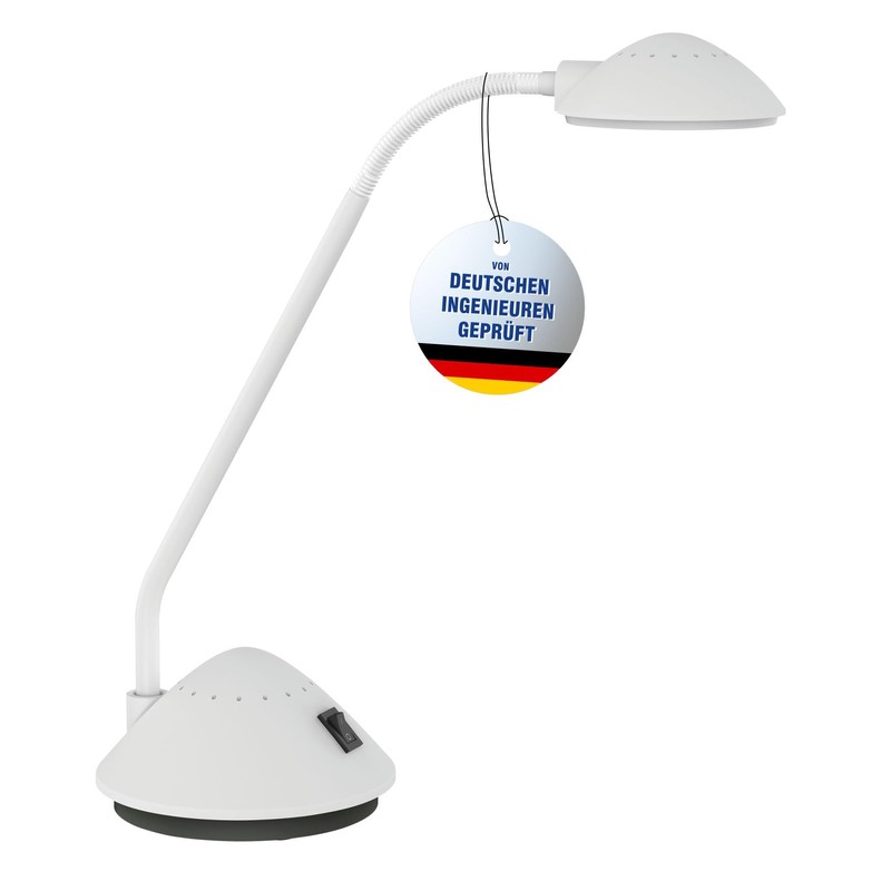 - Stable and flexible: the base and head of the LED table lamp are made of sturdy plastic; a flexible metal arm with rubberised surface ensures comfortable adjustment of the light angle.