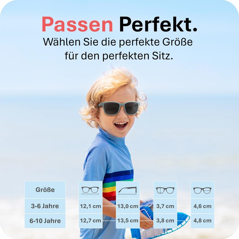 - Perfect fit: our comparison winner (according to the rating of comparison org) in children's sunglasses fits children aged 6-10 years. The children's sunglasses with flexible frame are designed to make perfectly fitting sunglasses for boys