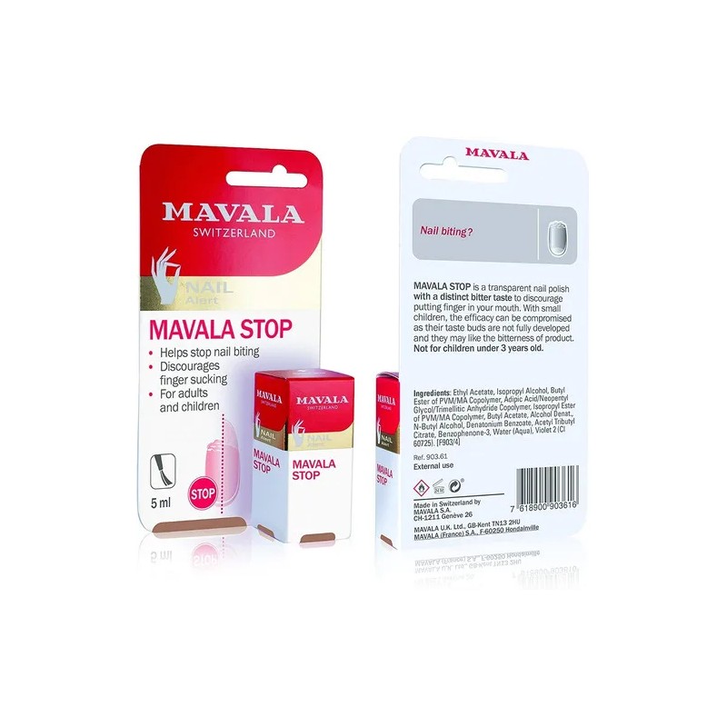 Mavala-stop es un esmalte transparente con sabor amargo diseñado para ayudar a mantener las uñas y su contorno en buenas condiciones. Apto para su uso solo o sobre esmalte de uñas, está dirigido tanto a niños (mayores de 3 años) como a adultos. En niños pequeños, la eficacia puede verse reducida debido a que sus papilas gustativas no están completamente desarrolladas y podrían no reaccionar al sabor amargo.