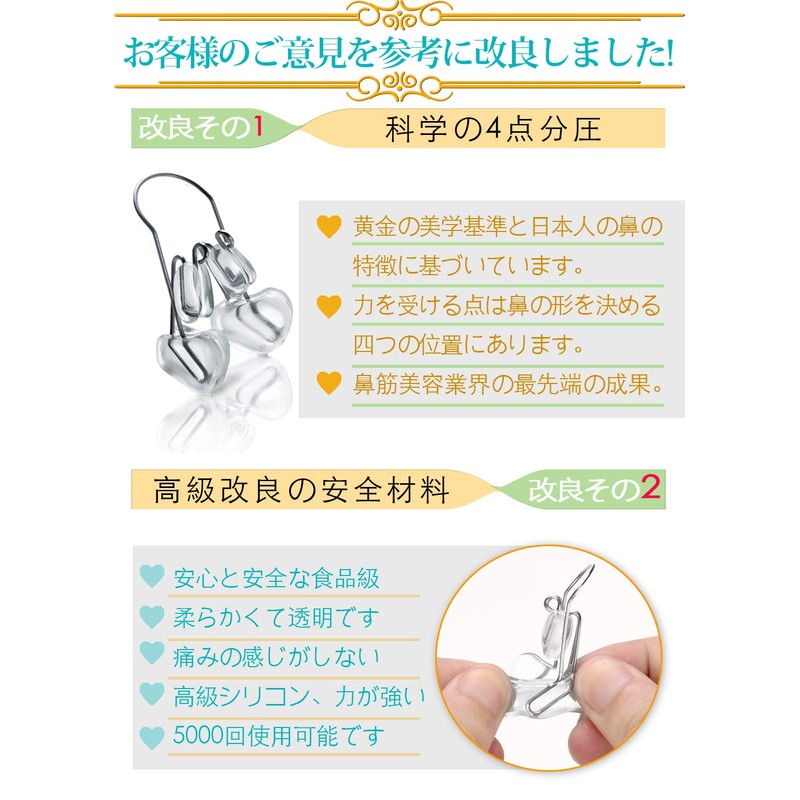 - 【Unique technology, patent product. Scientific 4-point sectional pressure and comfortable fit: We referred to over 50,000 Japanese noses and developed a 4-point depression structure with ergonomic and creative design. Maveni Nose Clip has 4 silica gels, these silica gel works with metal frames, perfectly fit your nostrils and no discomfort. A beauty and relaxation product worth everyday use. .