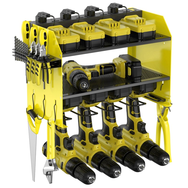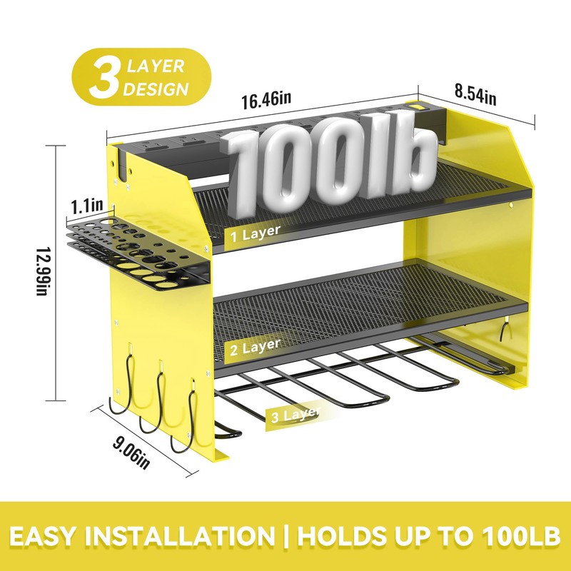 - All-in-One Storage: Keep your tools and batteries organized with this 3-tier wall rack. Includes 4 drill slots, bit rack, 4 hooks, and an 8-outlet power strip with a 6ft cord