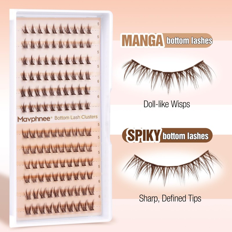 - Dual-Style Brown Bottom Lash Clusters: Manga & Spiky Mixed PackTransform your lower lash line with this essential brown bottom lash clusters, featuring 2 trending styles in 1 pack: manga style lower lashes for wide-eyed, doll-like anime effects and spiky style bottom lashes for defined, separated lower lash extensions. Perfect for achieving complete makeup looks, or natural enhancement. Enjoy ultimate versatility for creating dramatic eyes or subtle definition with authentic brown eyelashes.